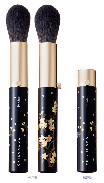 伝統工芸山中塗風の蒔絵を豪華に全面に施した携帯用パウダーブラシ。ふんわりとなめらかな肌あたりをお楽しみいただけます。チークとしてもお使いいただけます。