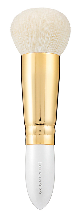 素材感を際立たせるために染色はせず、山羊本来の白色をそのまま筆に残しました。ビロードのような肌あたりでしっかりとした密度のファンデーションブラシ。